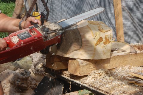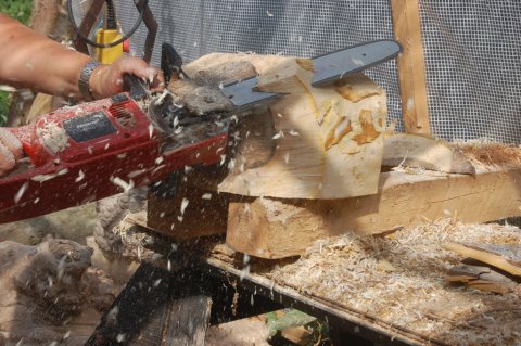Her ses så "savværket", hvor jeg findeler og tilpasser alle store stykker træ til drejebænken. Hjørnerne saves af, og klodserne rundes så meget, som det er nødvendigt i hvert enkelt tilfælde.