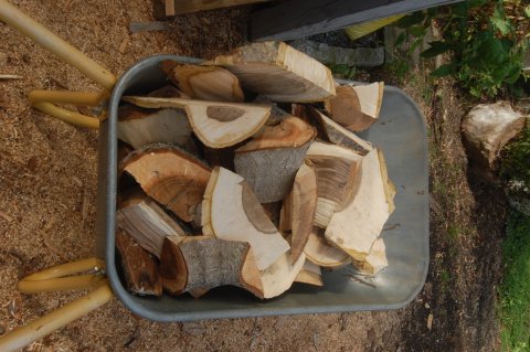 Hjørnerne og resterne fyrer vi med, og savsmuldet lægger vi i haven ligesom drejespånerne.