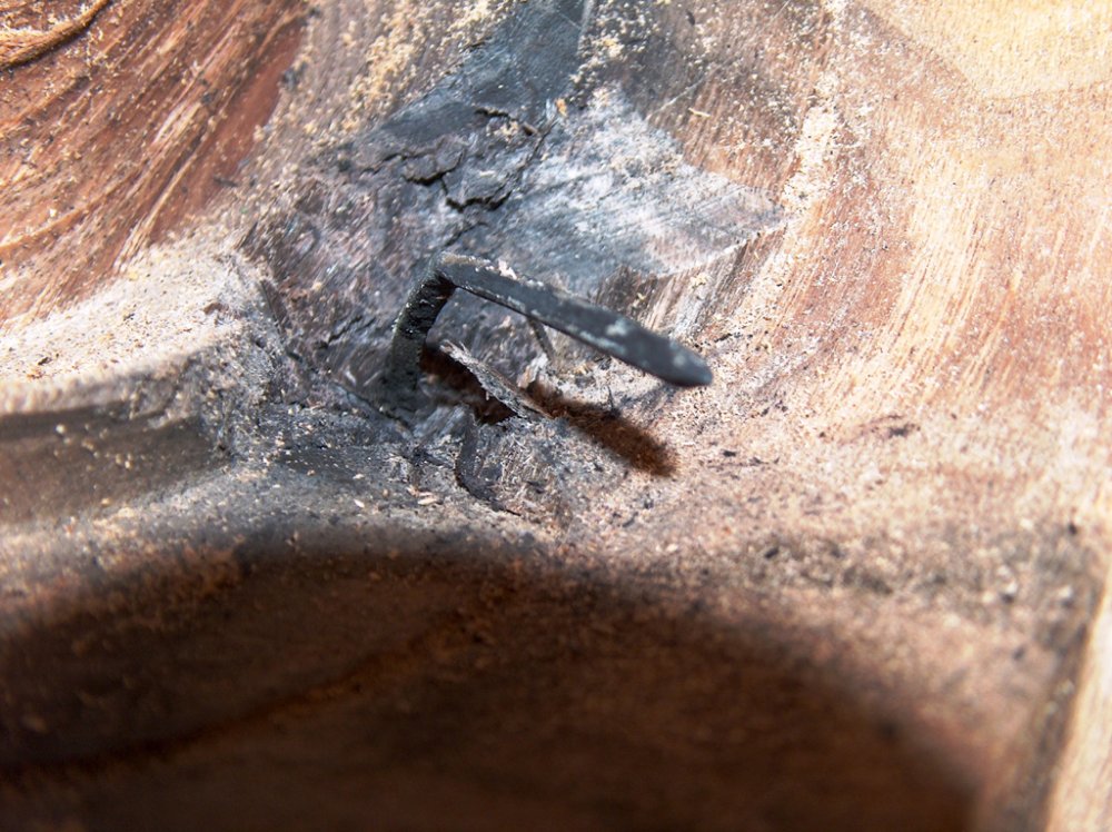 Det er ikke småting, der dukker op i træet, især havetræer. Her er et nydeligt 3 tommer søm, måske ikke direkte farligt, men møjirritirrende, når man nu er nået så langt med en fin valnøddeskål. Men så kan den blive til brænde, kan den!!
