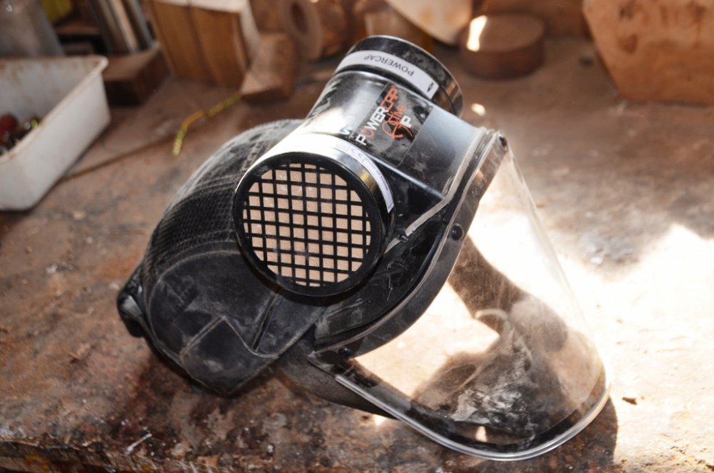 Jeg har eksperimenteret en del med udsugning, har nu monteret en gammel svejseudsuger på loftet. Den er koblet på det rør, du ser på højre billede herover, så udsugningen er så tæt på emnet som muligt. Men da selve emnet skaber en hvirvel, er det uundgåeligt, at støvet breder sig ud i rummet, så det er helt nødvendigt som minimum at anskaffe sig en god støvmaske mærket P2 for fint støv.