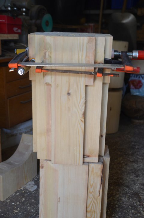 Jeg startede med at lime et utal af stykker fyrretræ i plader, derefter i store firkanter efter at have høvlet pladerne.
