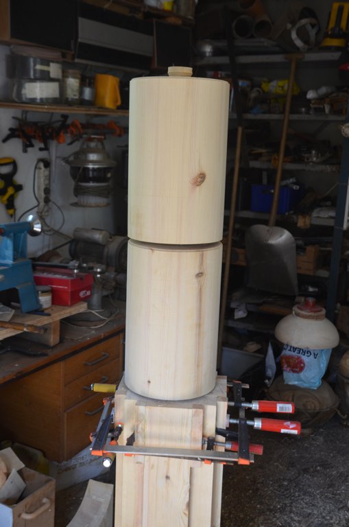 En københavnsk filmmand havde købt et særdeles fint og gedigent hus. Men taget over indgangspartiet blev understøttet af en trykimprægneret 3x3 og det er ikke lige det kønneste. Arkitekten regnede ud, at jeg sagtens kunne lave en græsk søjle med hoved og fod, ialt 2,14 m høj og Ø 28. Noget af en mundfuld! Det var nødvendigt at dreje den i 7 dele med propper, der kunne hjælpe med at samle nøjagtigt.